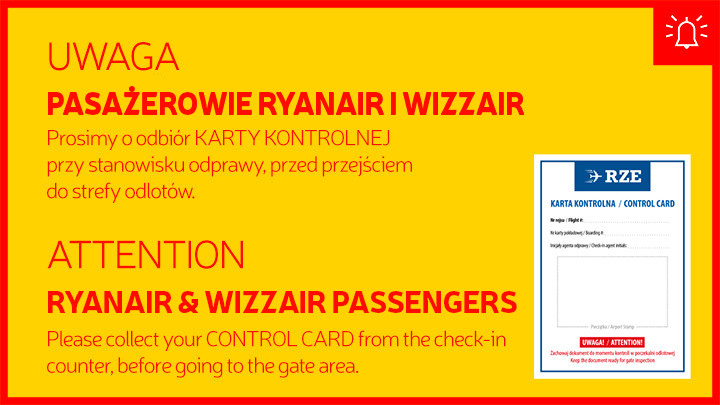 ATTENTION RYANAIR AND WIZZ AIR PASSENGERS! Please collect your CONTROL CARD from the check-in counter, before going to the gate area.