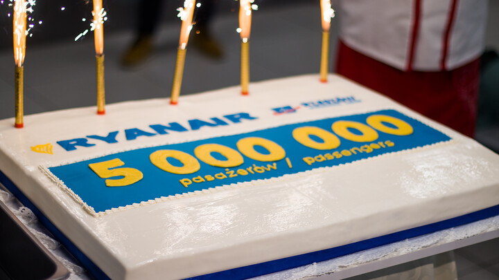 To celebrate the serving of the 5 millionth traveller, all the participants of Monday's flight no. FR2137 to London were treated to a commemorative cake. The jubilee passenger is an inhabitant of Jarosław. He travelled to the capital of Great Britain with his whole family to visit his father, who lives there, and his friends, as he himself had worked in England for 10 years. He received a valuable gift from the airline: a voucher for two tickets to and from Rzeszów on any route operated by Ryanair.
