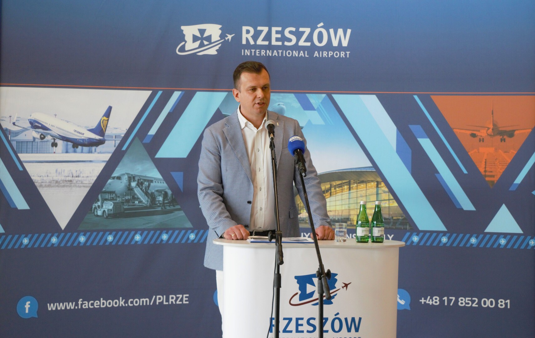 Prezes Adam Hamryszczak podczas konferencji przedstawił całą siatkę wakacyjną z Jasionki. fot. Małgorzata Tworzydło