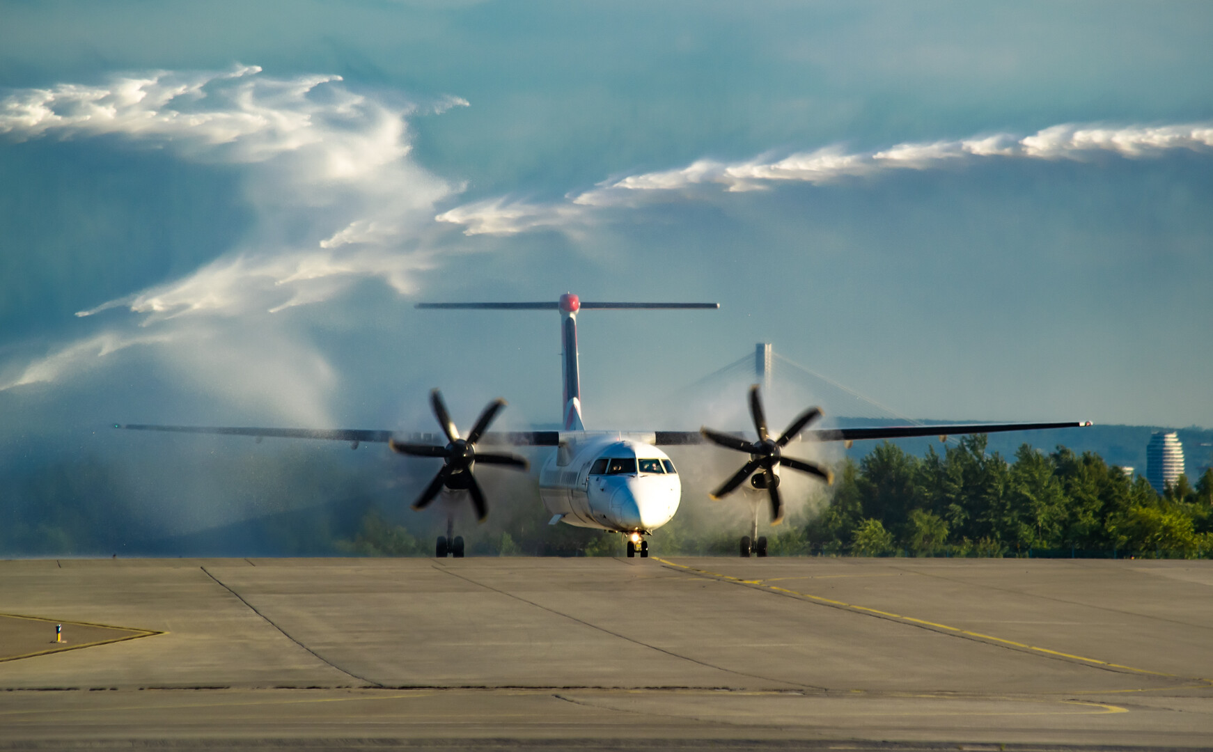 Pierwszy samolot z Olsztyna przywitał tradycyjny salut wodny. Fot. Wanda Dziura