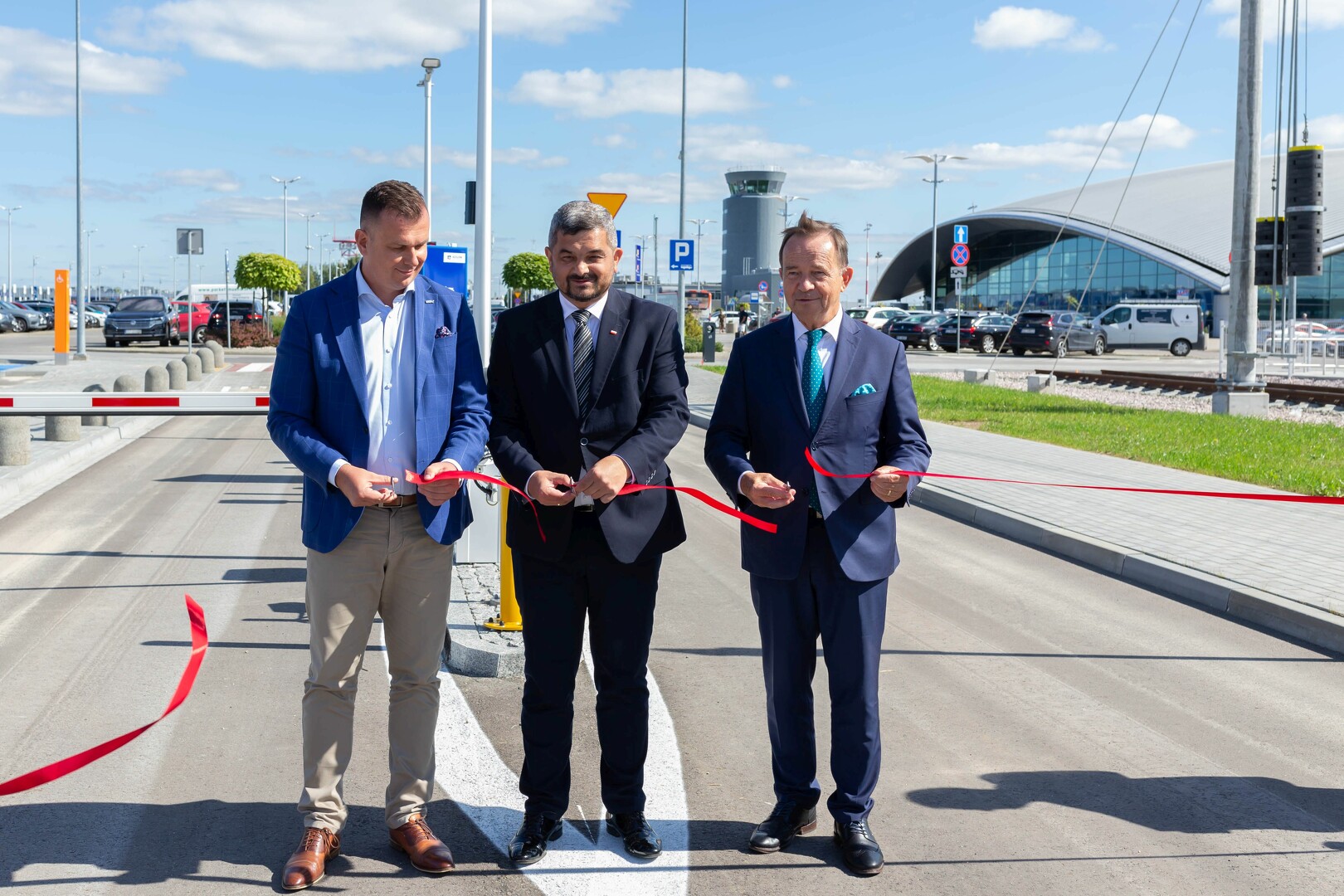 W uroczystym przecięciu wstęgi przed nowym parkingiem uczestniczyli (od lewej): prezes lotniska Adam Hamryszczak, poseł Krzysztof Sobolewski oraz marszałek województwa Władysław Ortyl. Fot. Łukasz Ożóg/port lotniczy Rzeszów-Jasionka