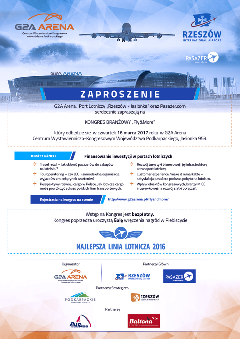 Już 16 marca 2017 r. w G2A Arena Centrum Wystawienniczo-Kongresowym Województwa Podkarpackiego w Jasionce odbędzie się pierwsza edycja Kongresu branżowego „Fly&More”.