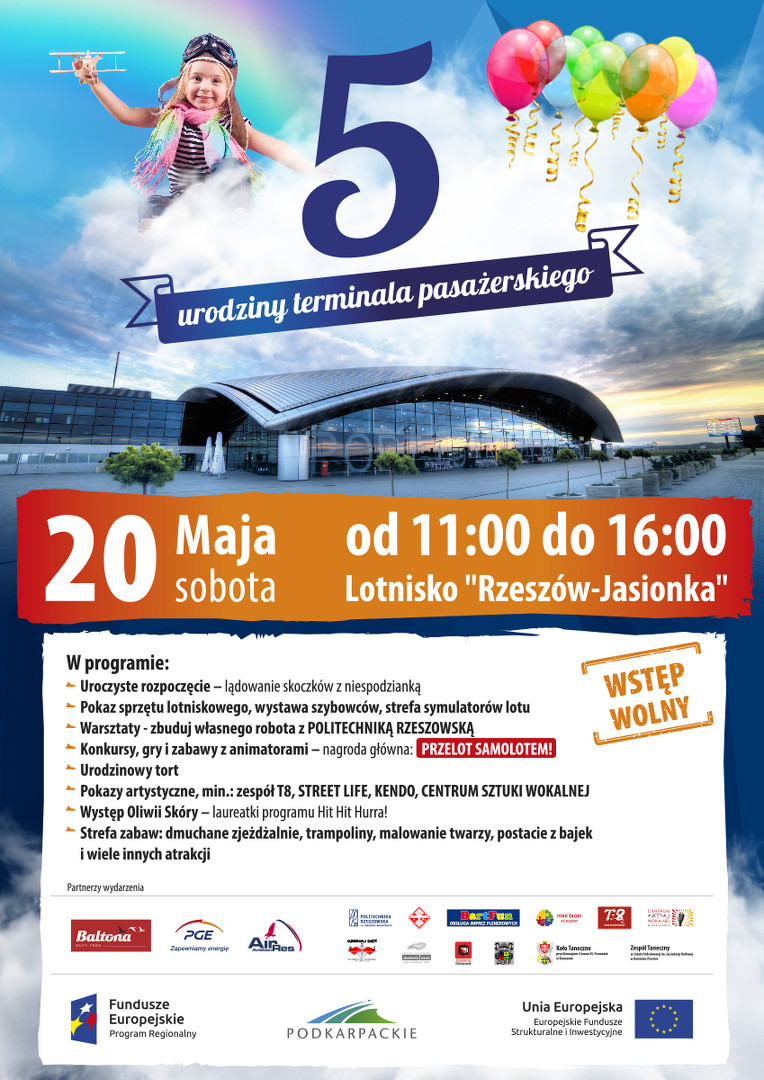 W sobotę 20 maja br. pasażerów i wszystkich, którzy tego dnia odwiedzą podrzeszowskie lotnisko czekają niecodzienne atrakcje. Z okazji 5-lecia terminala pasażerskiego odbędzie się Dzień Otwarty, podczas którego zarówno dzieci jak i dorośli będą mogli bliżej poznać kulisy pracy portu lotniczego.