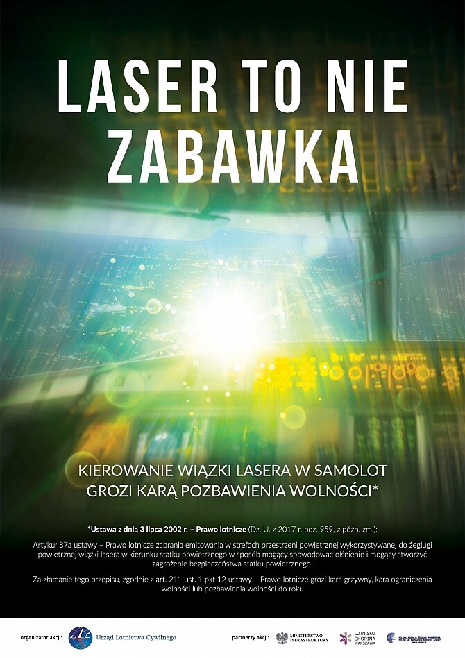 Uwaga! Zabrania się emitowania lub powodowania emisji, w strefach przestrzeni powietrznej wykorzystywanej do żeglugi powietrznej wiązki lasera lub światła z innych źródeł w kierunku statku powietrznego w sposób mogący spowodować olśnienie, oślepienie lub wystąpienie poświaty i mogący stworzyć zagrożenie bezpieczeństwa statku powietrznego albo życia lub zdrowia załogi lub pasażerów na jego pokładzie (artykuł 87a Ustawy Prawo Lotnicze).