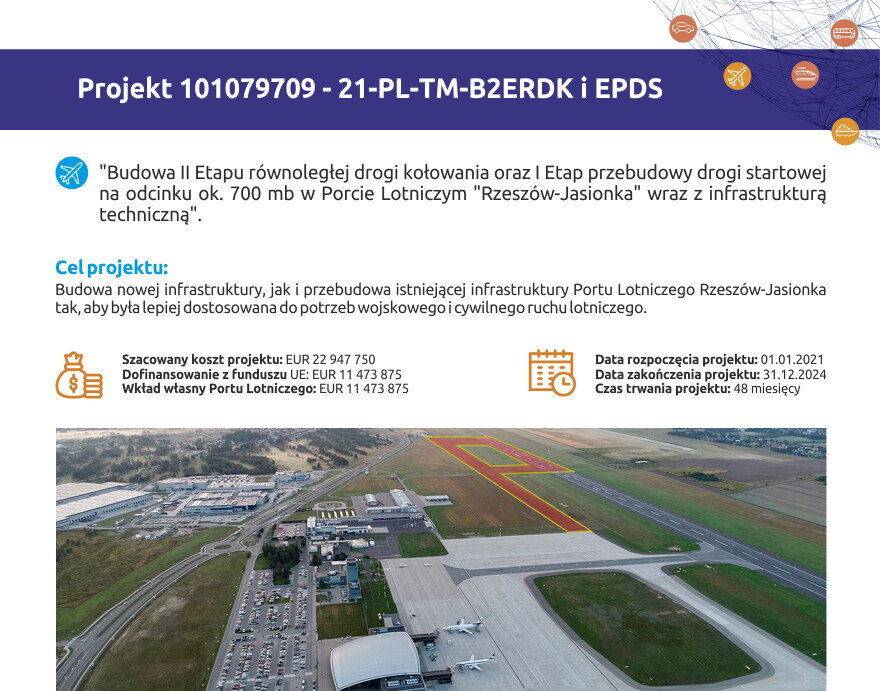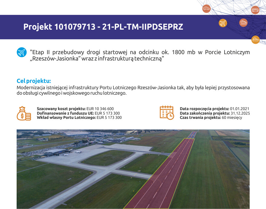 Projekt dotyczy przebudowy pasa startowego na odcinku ok. 1800m, szerokości 45m z poboczami 2 x 17,5m wraz z towarzyszącą infrastrukturą techniczną.