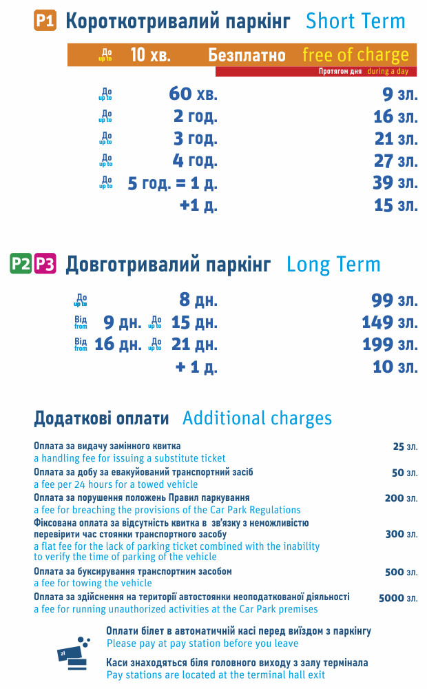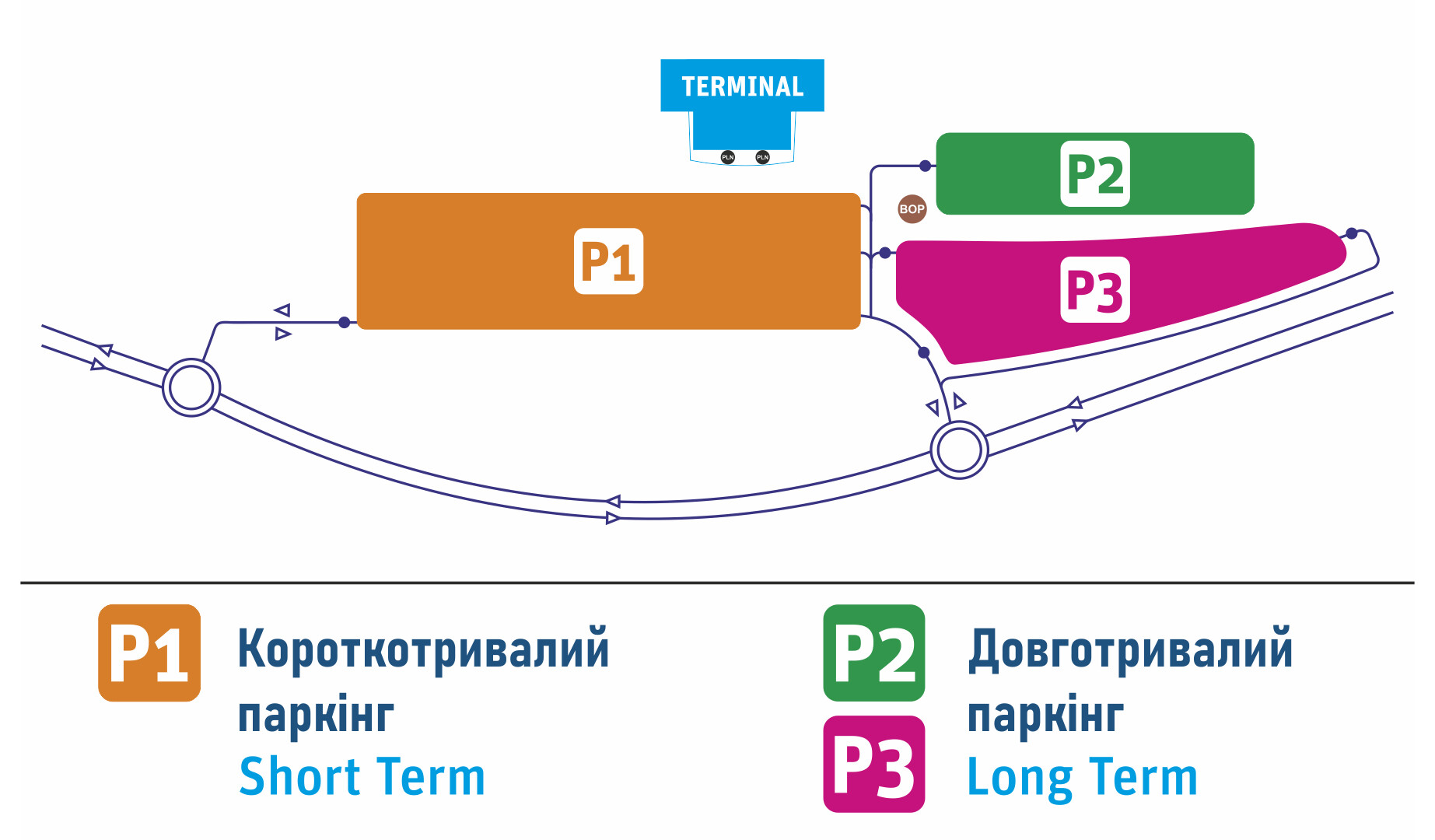 Короткострокова автостоянка (P1), що не охороняється, розташована безпосередньо біля пасажирського терміналу.